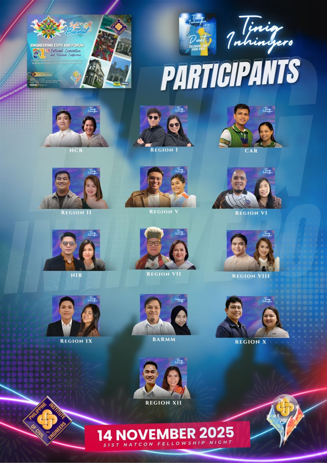 Representing the different regions across the country, these talented engineers are ready to showcase their voices and camaraderie at the 51st PICE National Convention Fellowship Night this November 14, 2025 in Bacolod City!